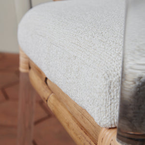 Nestled between the rugged coastline and cosmopolitan downtown, San Francisco's Sea Cliff neighborhood is known for its impressive architecture back dropped by expansive Bay vistas. This arm chair embraces Sea Cliff inspiration with a balance of airy materials and sophisticated details, with rattan hand-bent into a leaf like motif and light-catching acrylic.